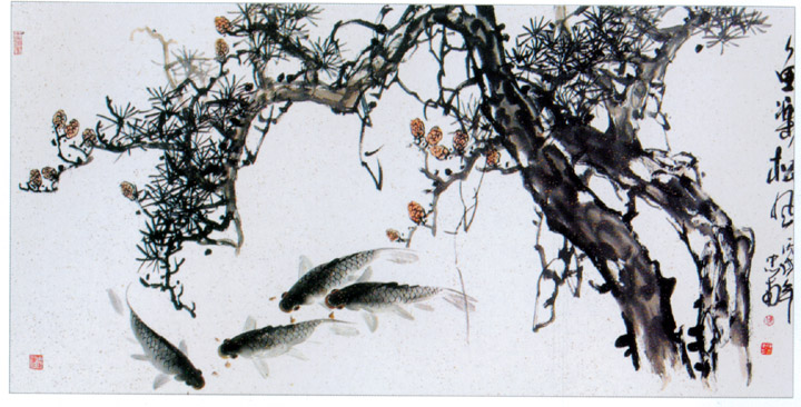 当今画坛,也有许多画家画鱼。但往往不是摹仿古人-在传统中跳不出来,就是乱涂一气,毫无新意,据我观察当代真正能在鱼上创新,画出时代特征的画家,当数南北二陈,即陈永锵和陈忠南。二陈均是多面手,花鸟、山水、人物样样题材信手拈来,"鱼"画更是他们的看家本领。犹如囊中探物,所画之鱼无不栩栩如生。