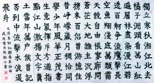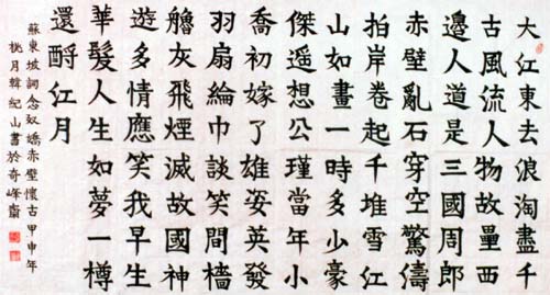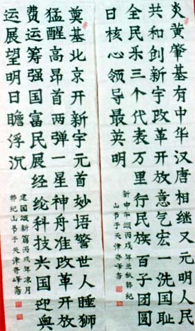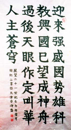 韩纪山 男,1945年5月生,天津武清人。号江山,奇峰斋主。现任世界教科文卫组织(专家成员),文化部文化市场发展中心(专职书法家)、中国中华传统文化研究院(高级书法师),天津市夕阳红俱乐部(会员)。 擅写软笔楷书自创体、编歌、谱曲、拉二胡。1998年5月由中华当代 书画艺术研究会聘为名誉教授,同月有作品选入韩国9...